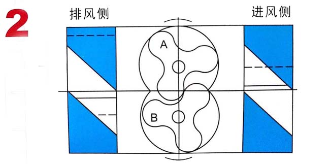 B轉(zhuǎn)子:進風(fēng)側(cè)剛剛進入閉合行程,處于循環(huán)閉合的狀態(tài),羅茨風(fēng)機排風(fēng)側(cè)已循序打開,即將到達全開狀態(tài)。