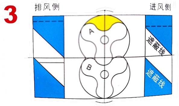 B轉(zhuǎn)子:進風(fēng)側(cè)處于即將到達機殼遮蔽線的狀態(tài)。排風(fēng)側(cè)處于排風(fēng)過程中,三角孔循序打開的狀態(tài)。