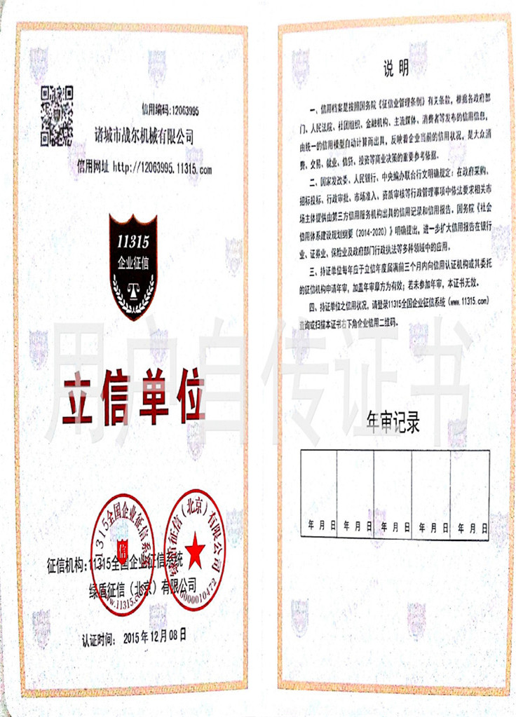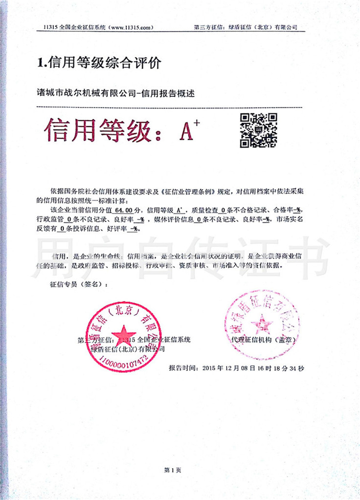山東戰(zhàn)爾機(jī)械有限公司座落于著名的“恐龍之鄉(xiāng)”山東省諸城市,通過(guò)ISO國(guó)際質(zhì)量體系認(rèn)證,國(guó)家頒布的信用A+企業(yè),有立業(yè)必先立人,立人必先立信的執(zhí)念。